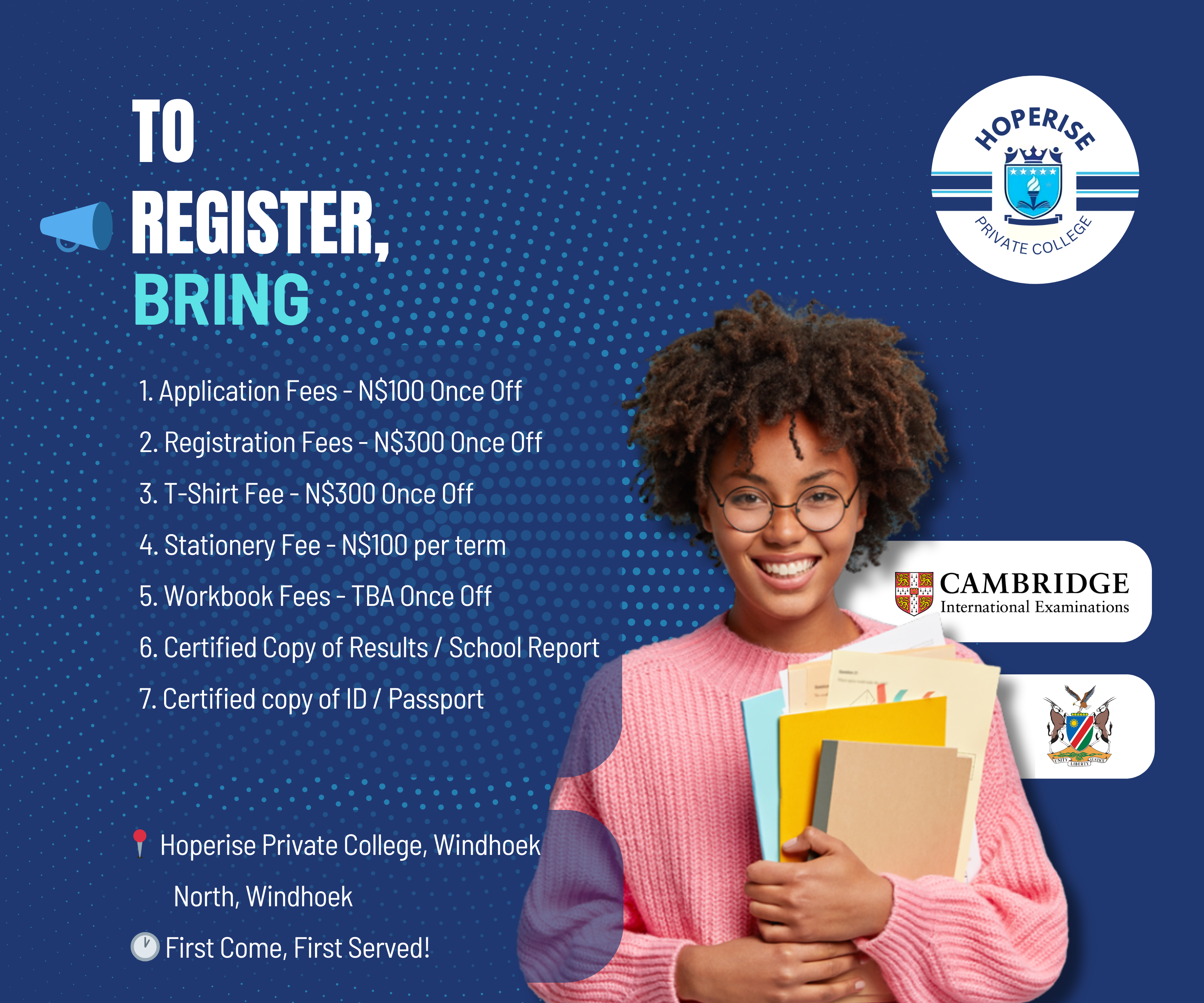 Competitive fees with simple requirements: ID, previous results, registration fee, and first installment to get started.